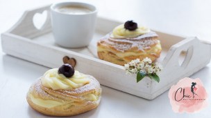 - Bignè di San Giuseppe con crema pasticcera e cosparsi di zucchero a velo;