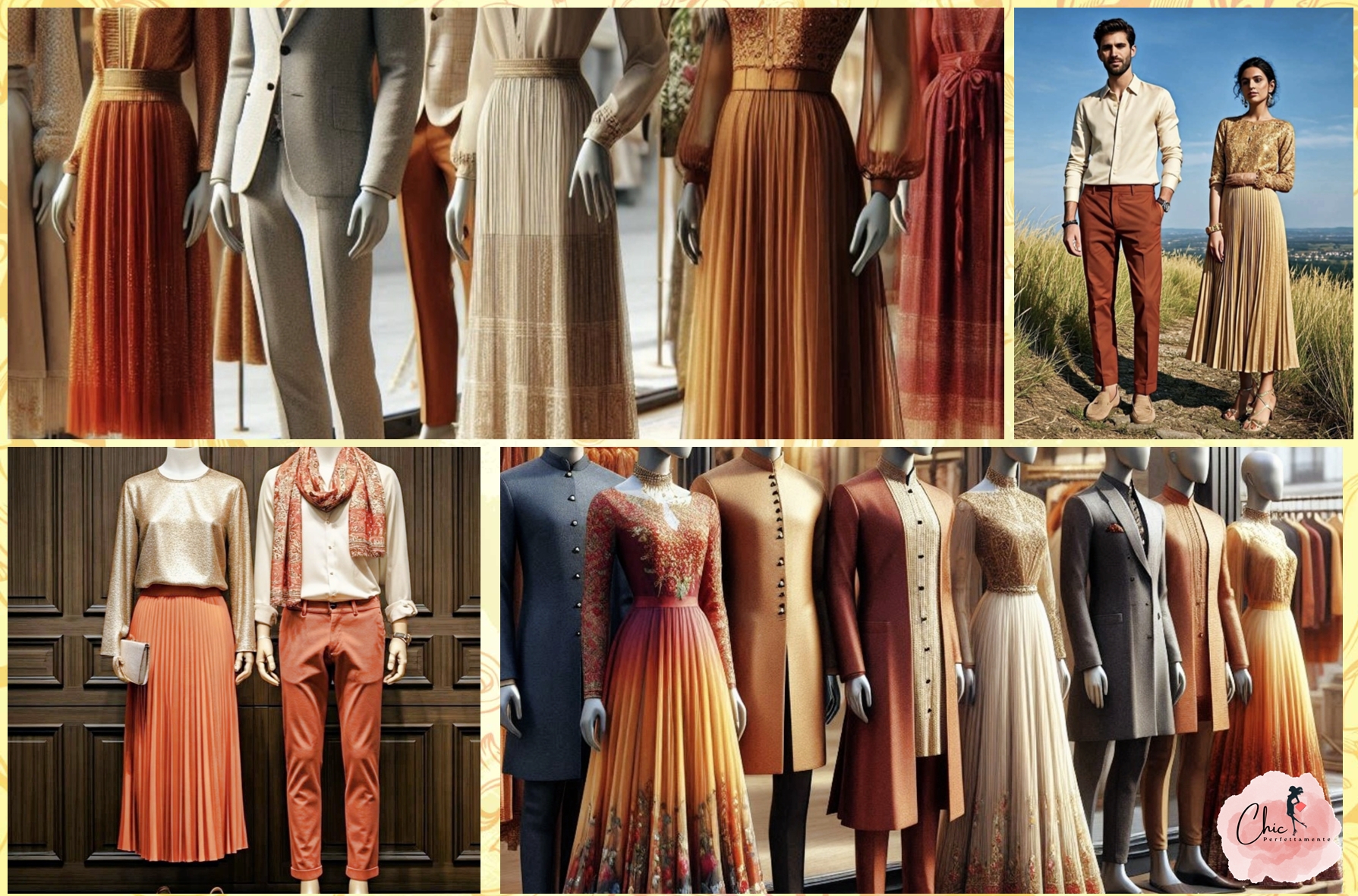✔ Abiti lunghi o midi eleganti in colori caldi e festosi (oro, arancione, rosso, bordeaux) o tonalità luminose come champagne o bronzo.
